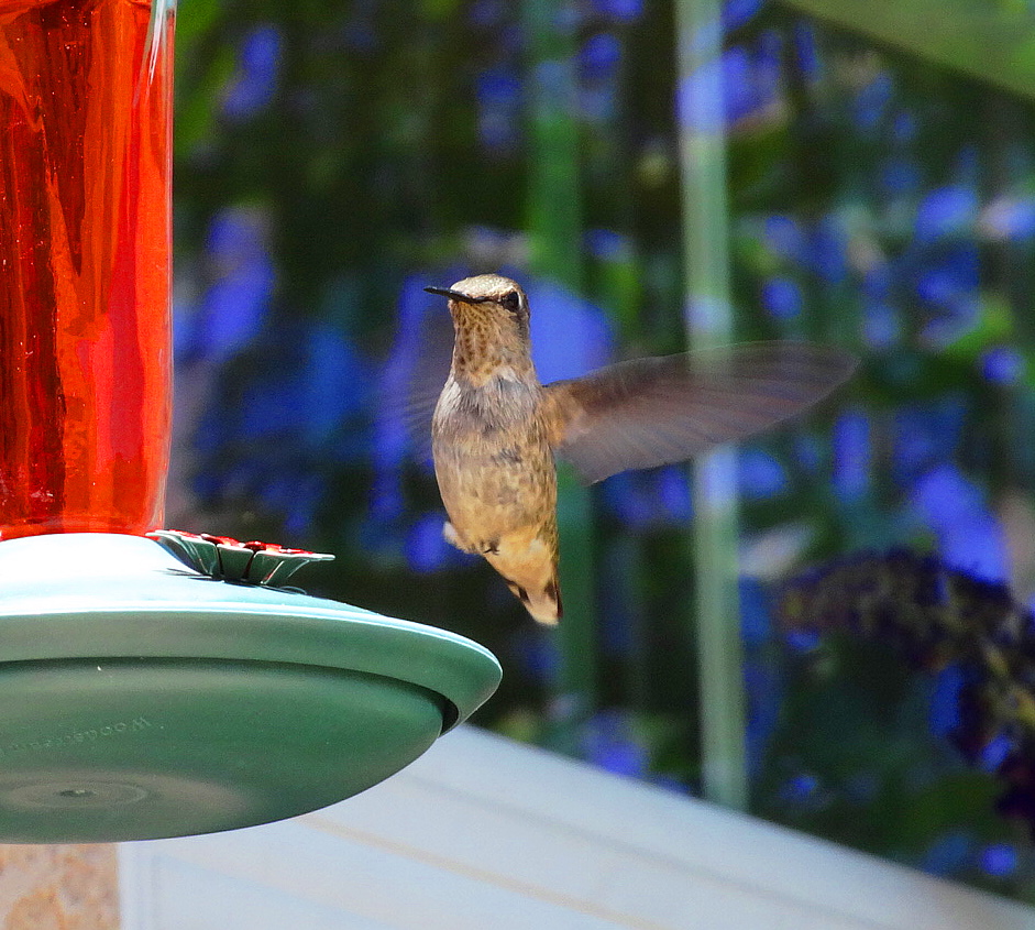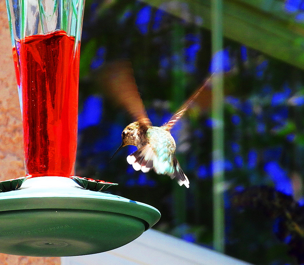 My husband likes the shots of them still, but I prefer snagging them in flight. There’s a new one around with a beautiful blue throat, but he keeps getting dive bombed by the locals so I haven’t got a good snap of him yet. I swear he hovers around me for protection. When they dive bomb him, they are moving at incredible speed, when they make impact you could hear an audible woof sound and he makes a squeak. I feel sorry for the blue throated guy.