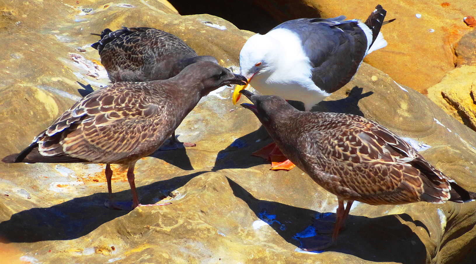 Mama seagull’s getting tired of feeding these pushy adolescents, they’re always demanding more fish and shrimp. Gimme, gimme, gimme! Adolescents of all species are frequently over-indulged in La Jolla. The seagull probably picked up this trait from watching humans. Just another example of the well known phenomona, seagull see, seagull do…..or is that monkeys?
