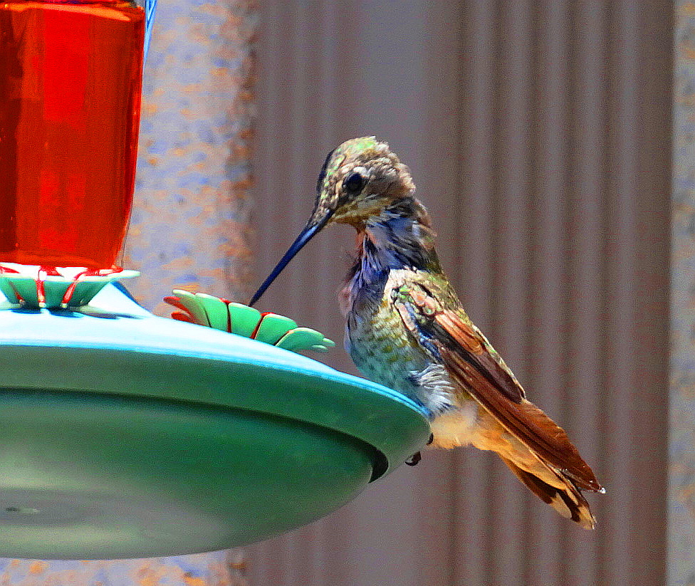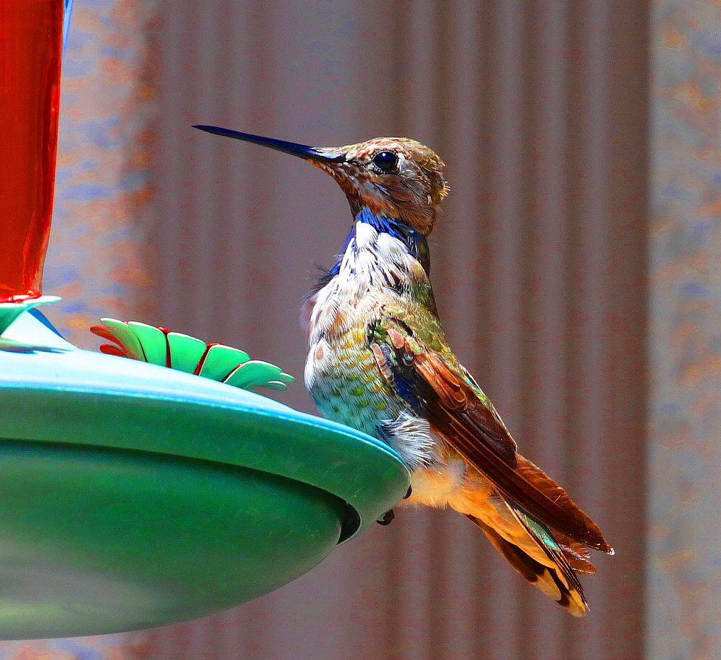 An hour of so later I went to the feeder and took all these photos of him. He was absolutely unafraid of me and these are the closest, more detailed shots of a hummingbird I have gotten to date. You can see that he is a little worse for wear and still not completely fledged, but he is getting plenty of nectar.