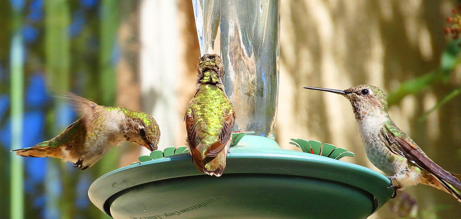 We have about ten active hummingbirds that are locals in this part of our garden. Others are in the orchards. The guy with his back to you looking scruffy, is the juvenile that flew into the window. You can see he is doing well. His wing is injured but it doesn’t affect his flying.