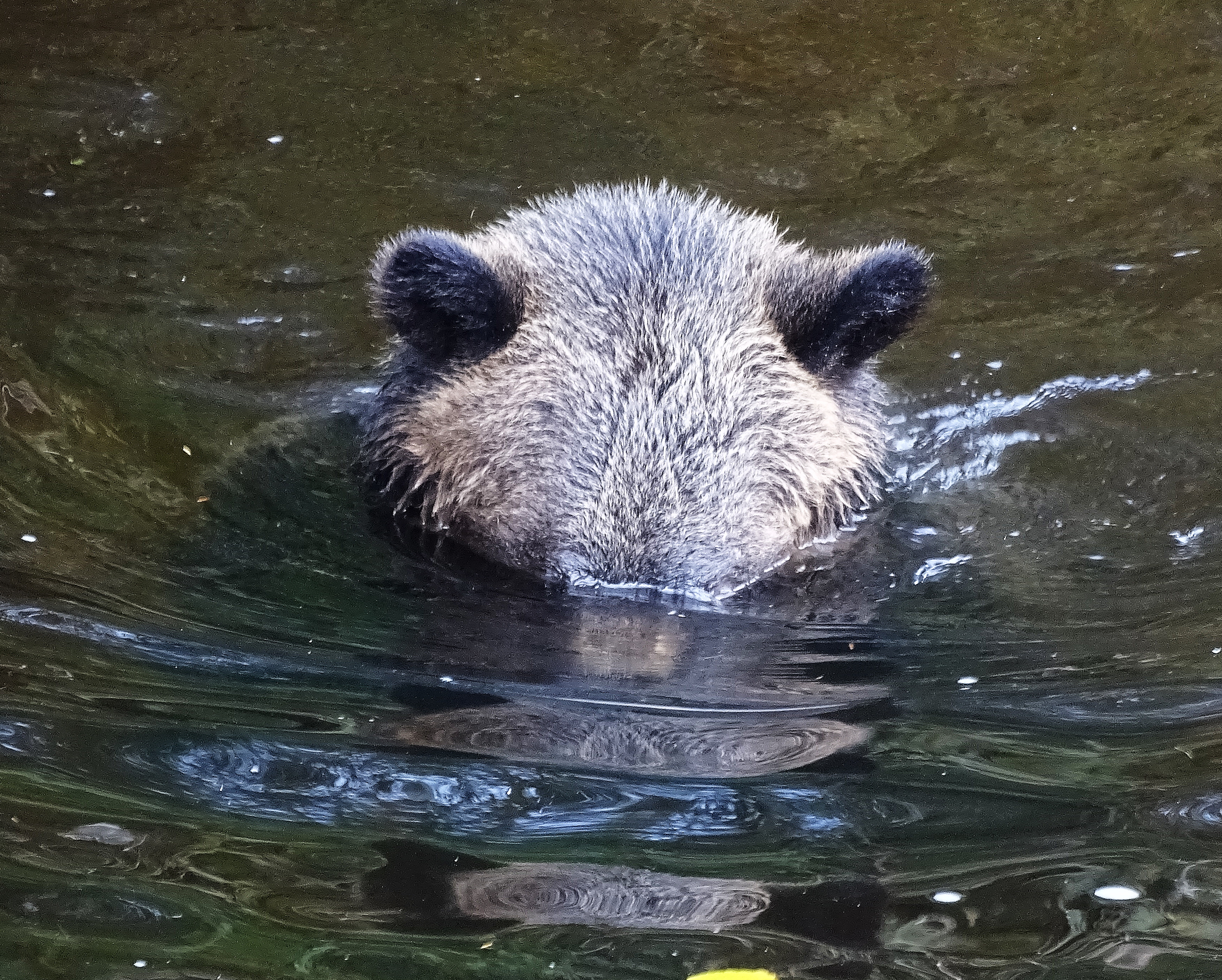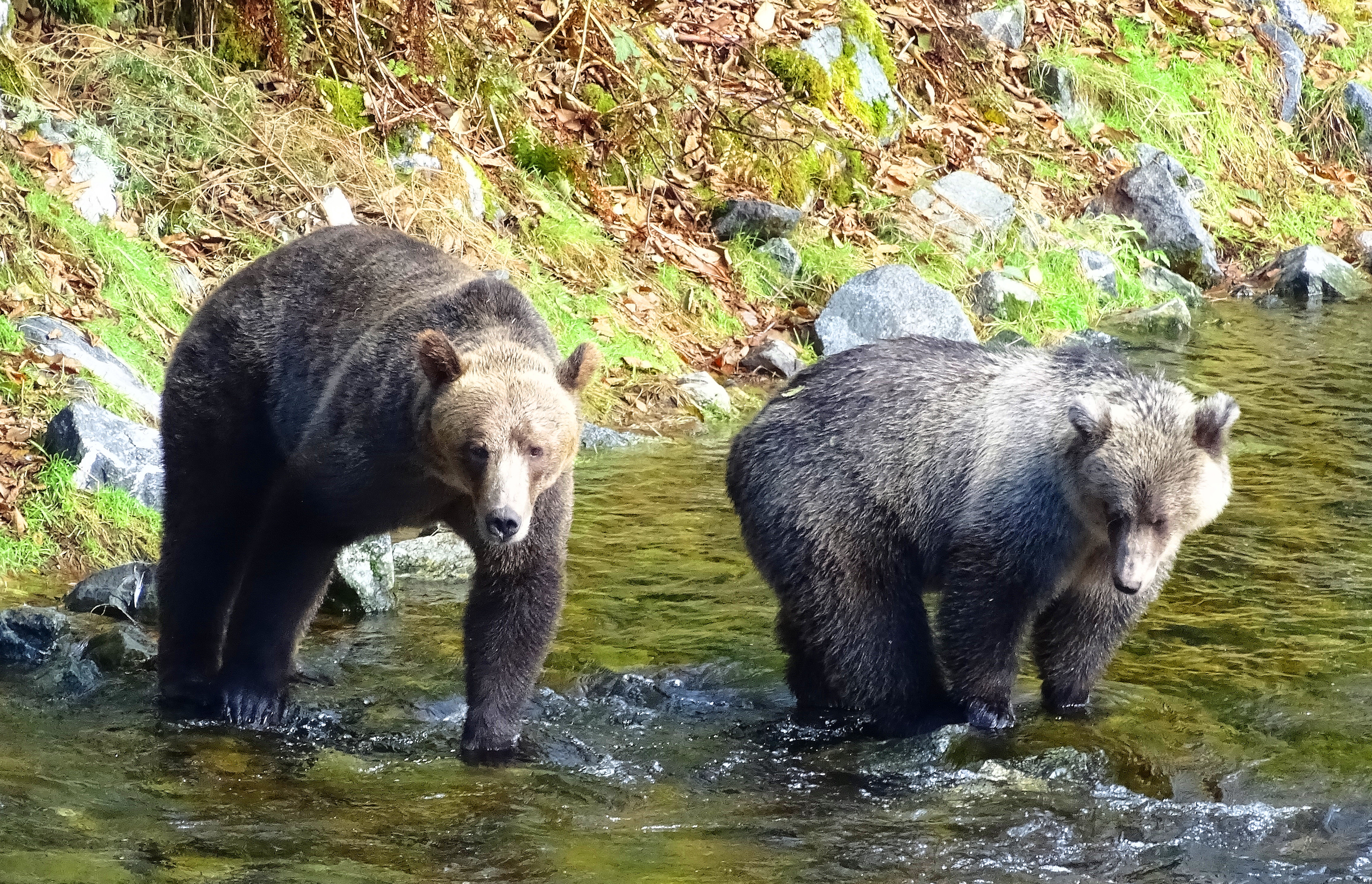 The bears, like this juvenile, are quite focused on consuming salmon and have devised an ingenious fishing method,