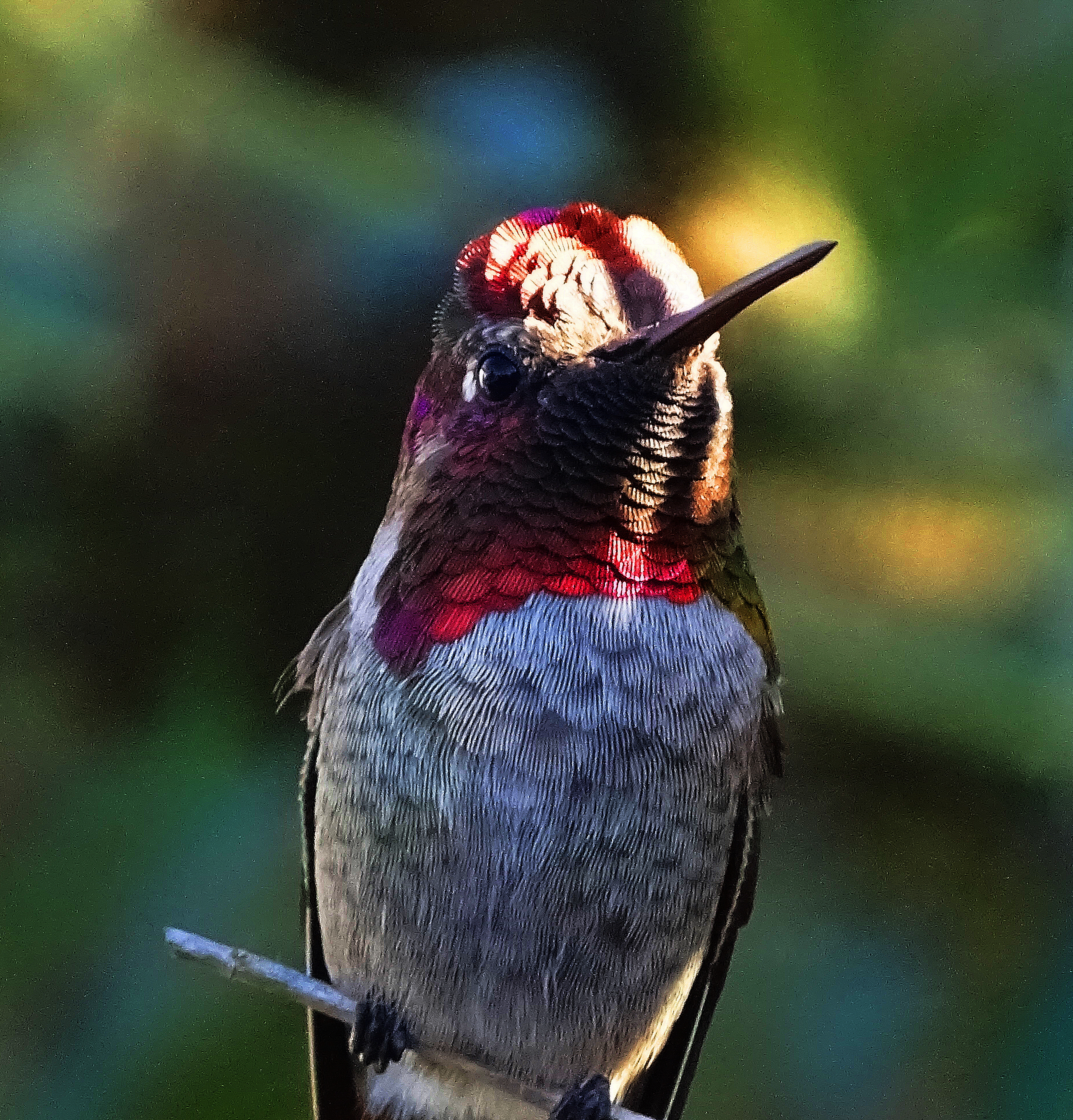 We have somewhere around 70 or more hummers at The Holler now, so we are getting lots of very bright color. Hummers flash their colors at will, sometimes as warnings when sparring. This guy was caught at dusk, flashing away to keep intruders at bay.