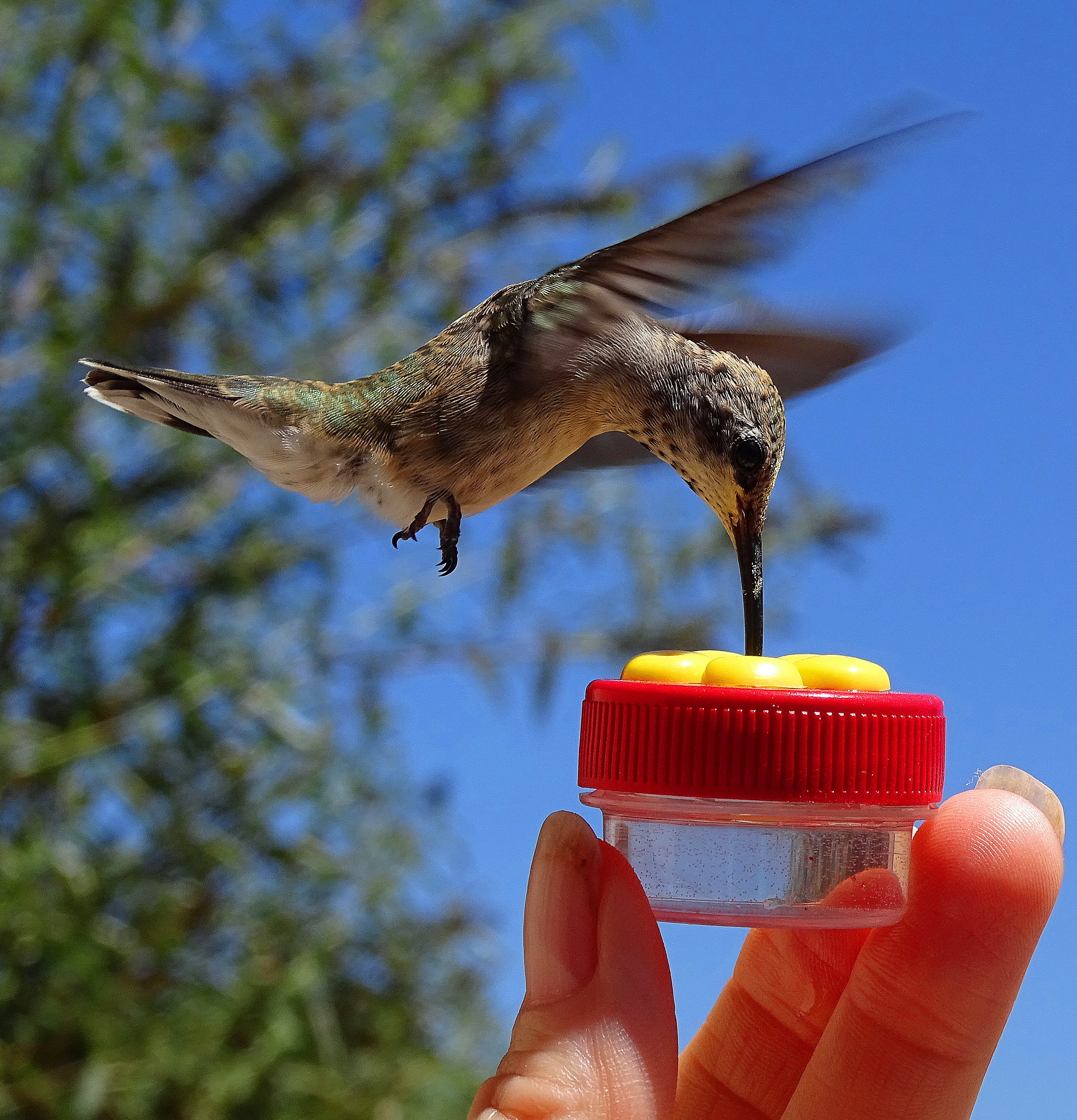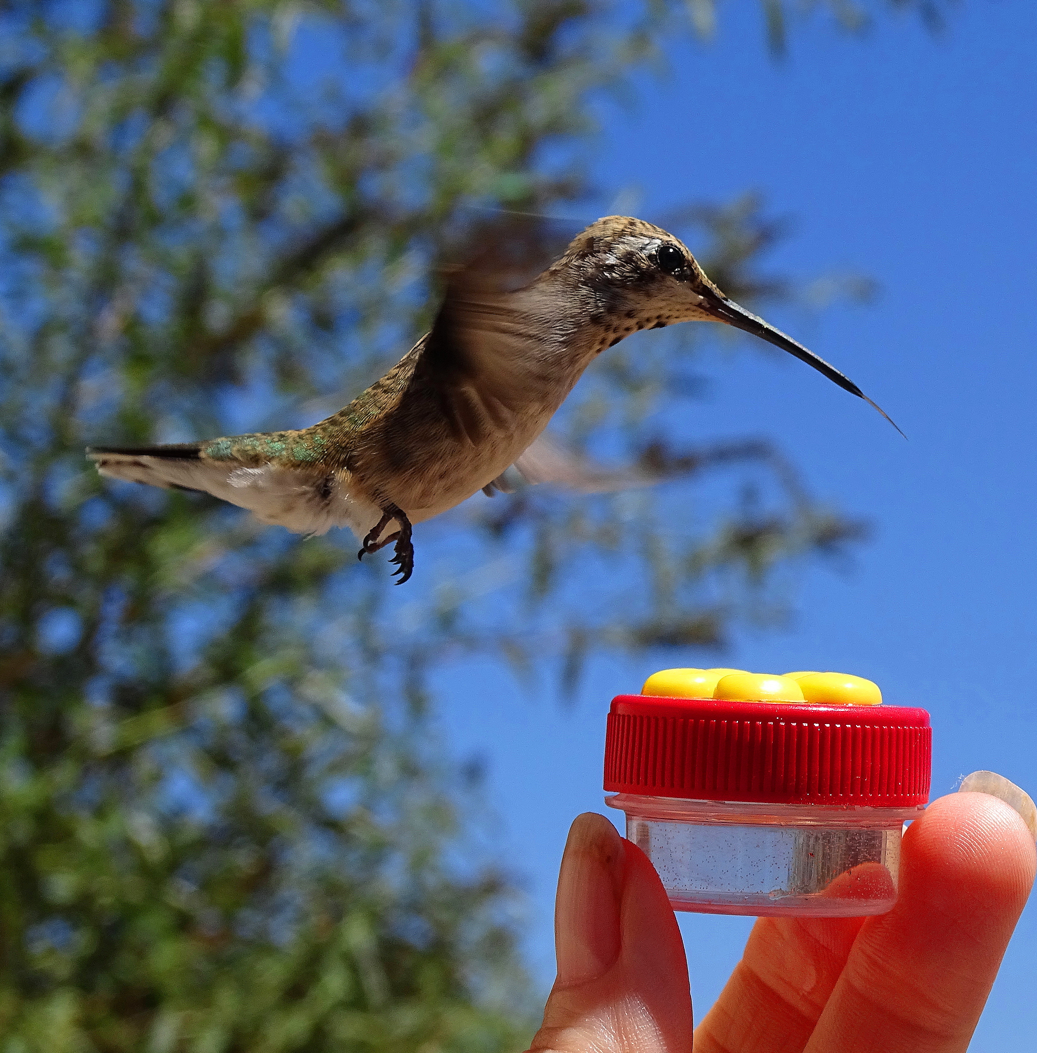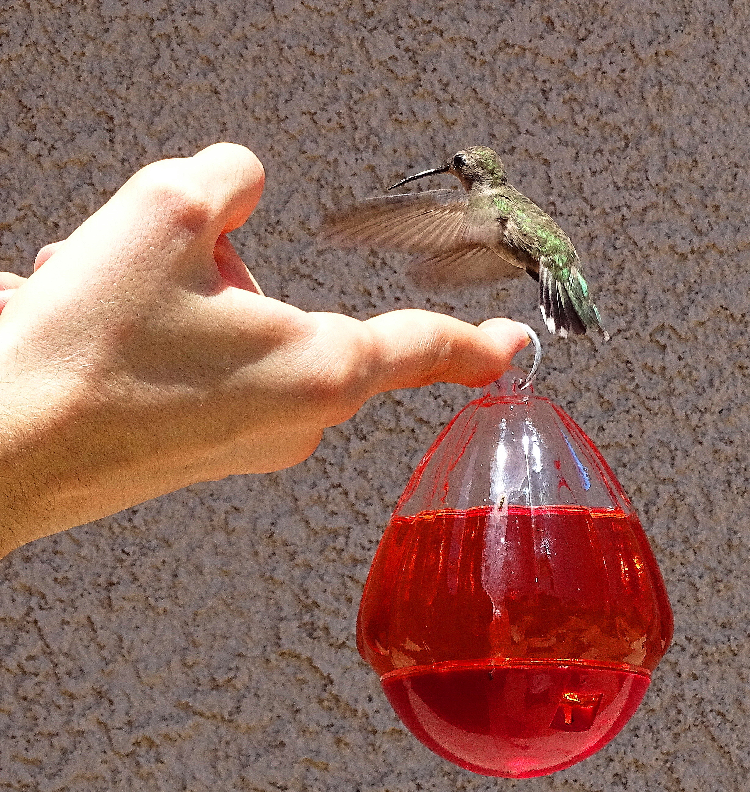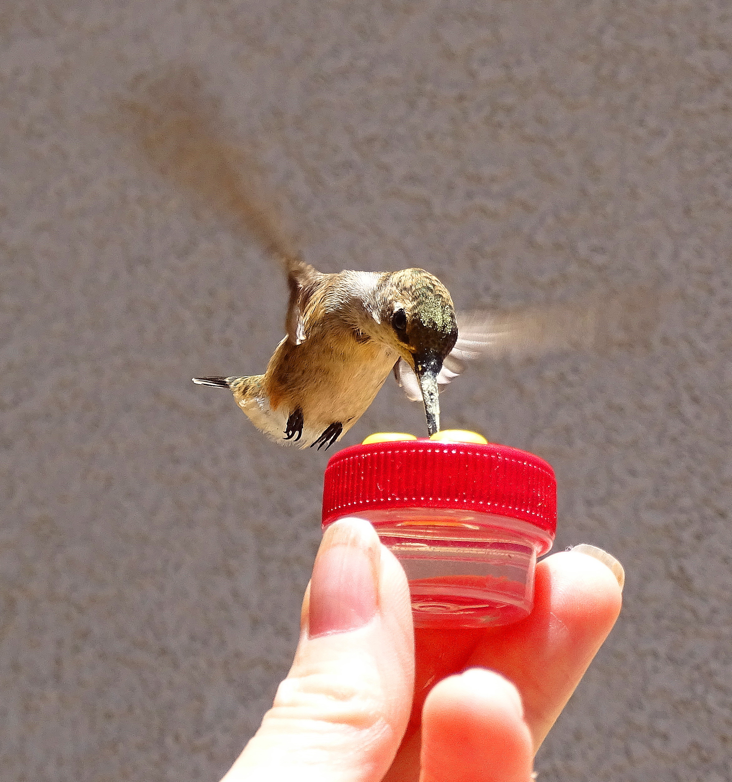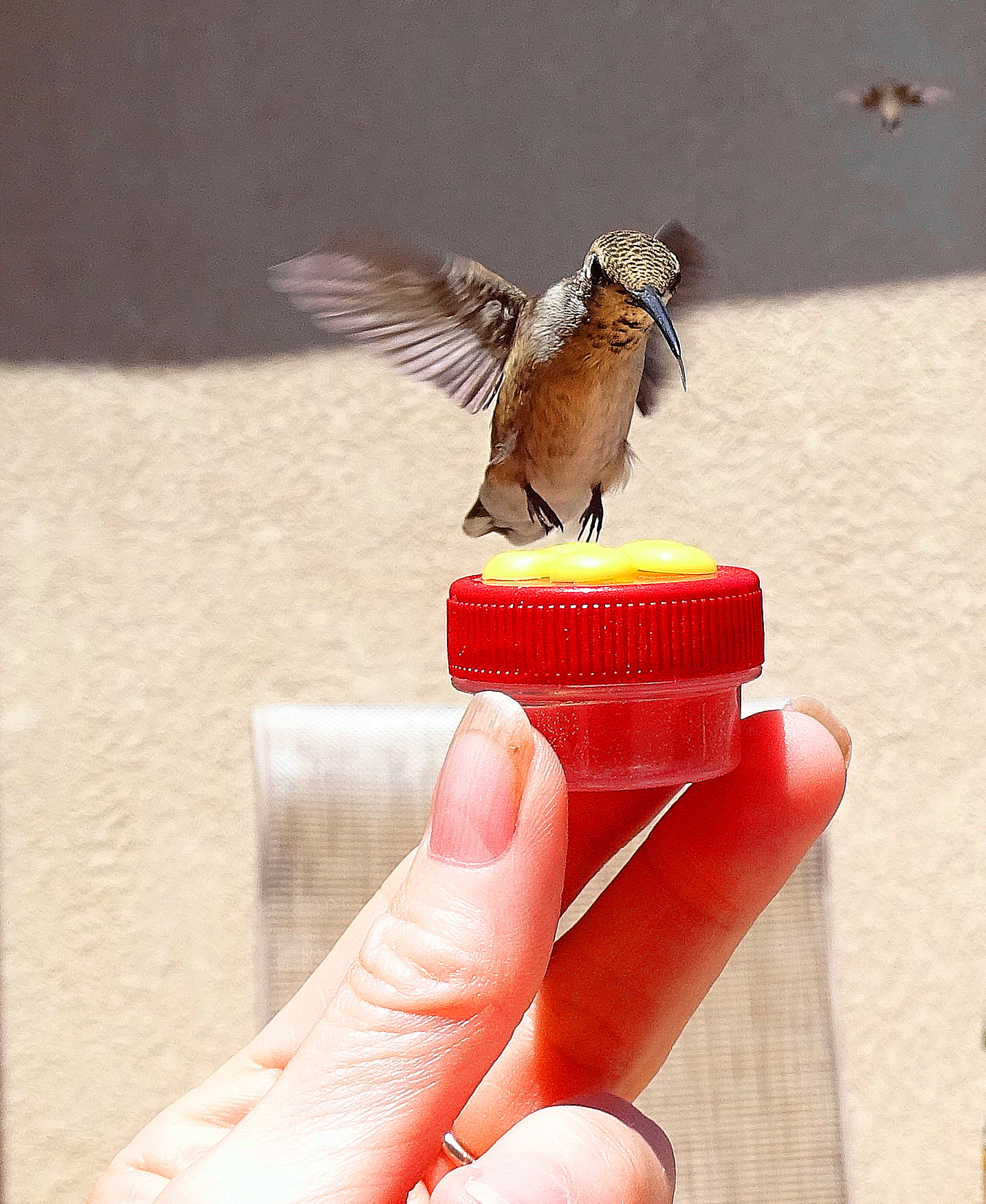 Once a year, at peak swarm, I feed the hummers by hand. I only do it once, for about an hour because I don’t want the hummers to become tame, thinking all humans can be trusted, because unfortunately, as we all know, some humans should not be trusted.
