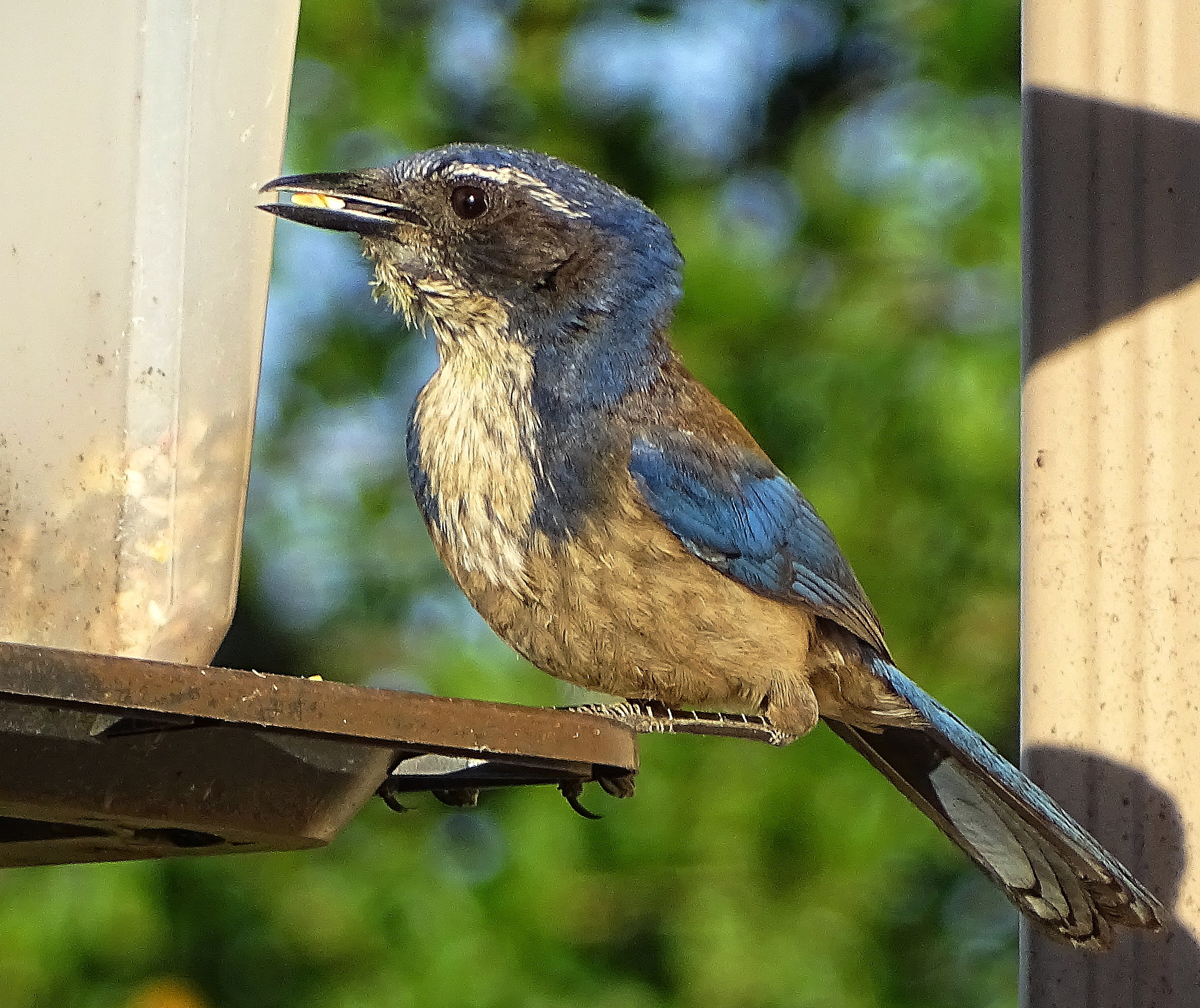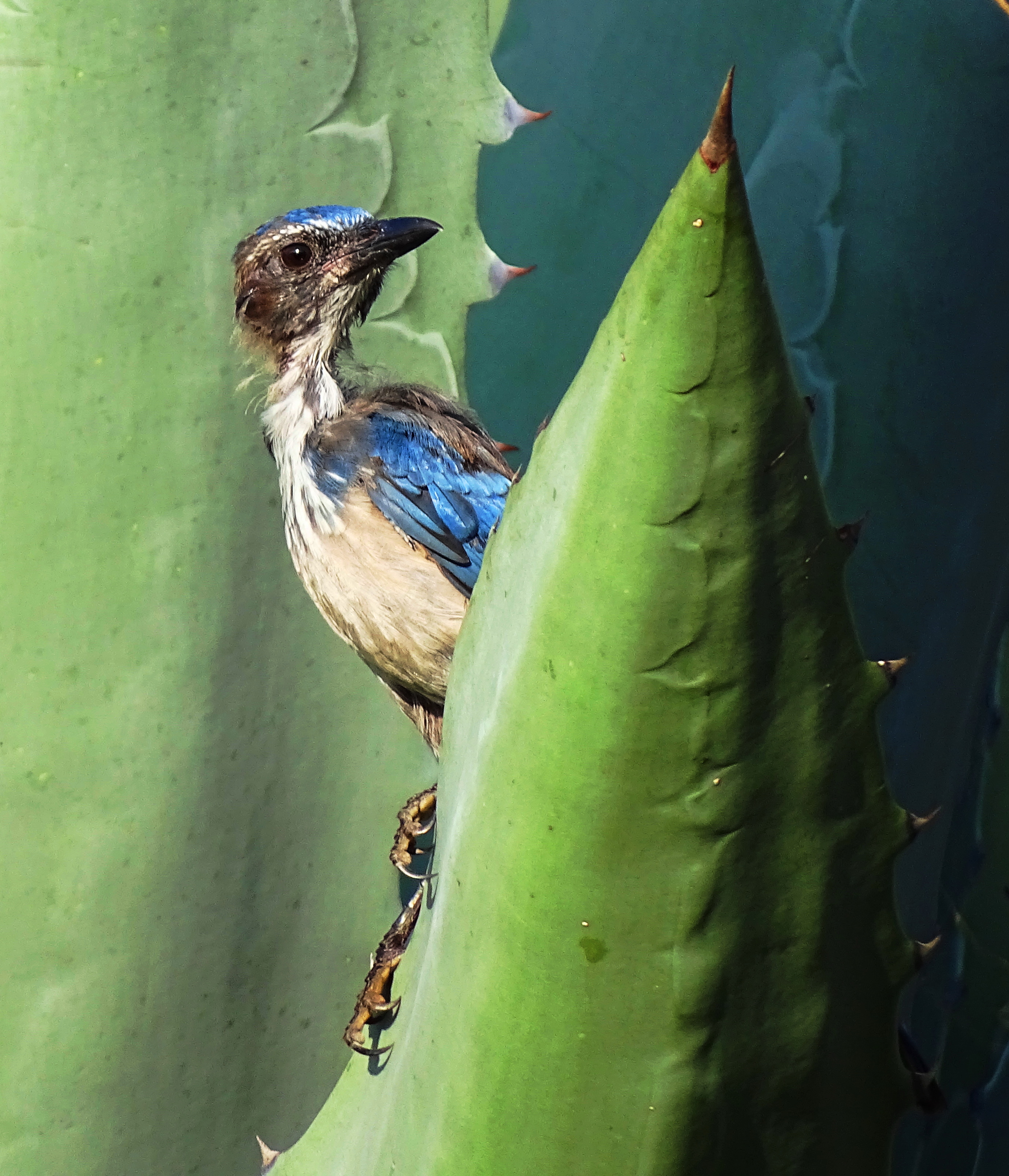 This Scrub Jay is worse for wear. It looks like something, probably the Roadrunner, grabbed him by the neck.