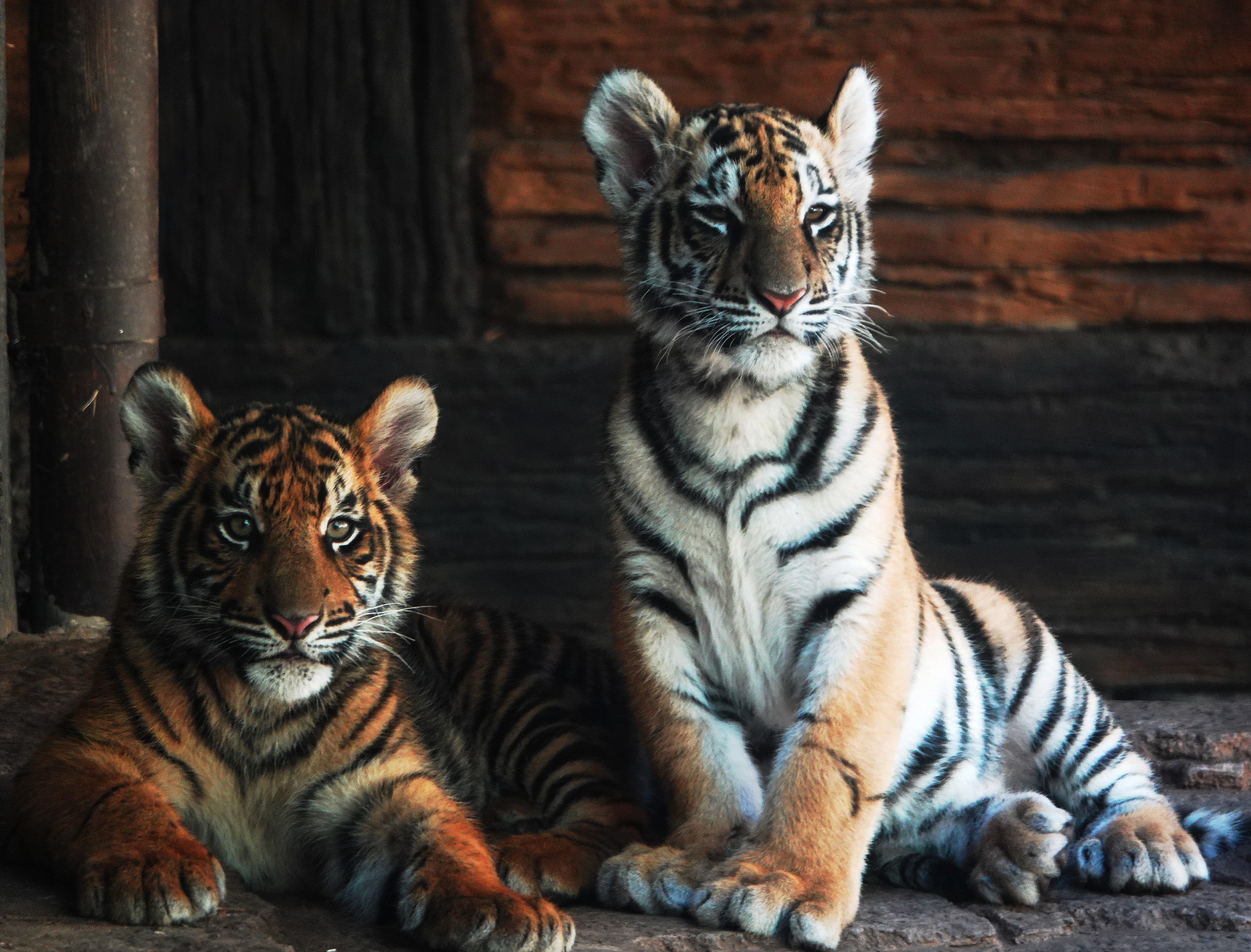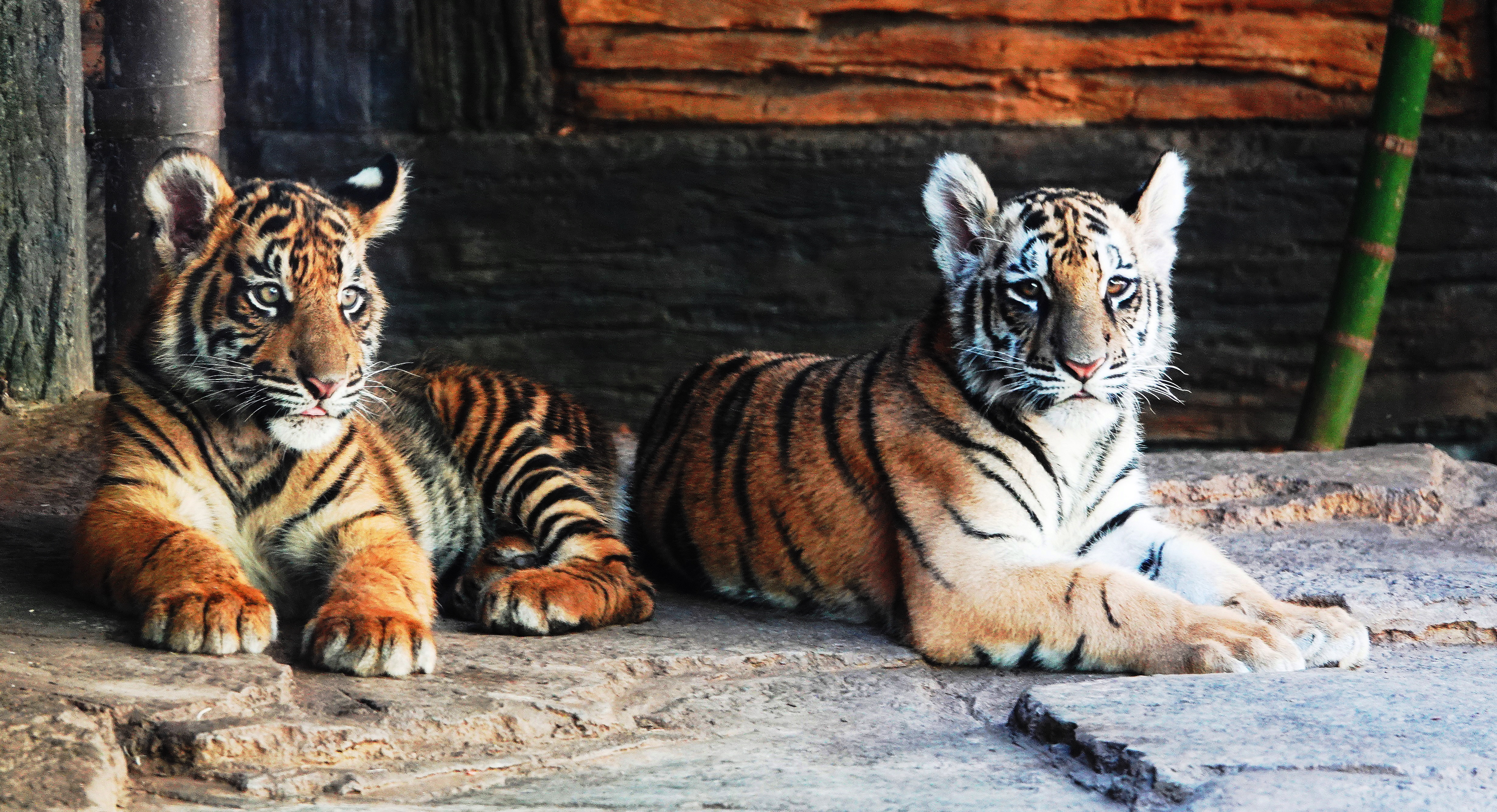Meet the tiger cubs. One cub was brought to the park from The National Zoo after it was rejected by its mother and the other was confiscated at the San Diego/Mexican border by patrol agents when it was seven weeks old. One is a Bengal Tiger and the other a Sumatran. There are less than 400 Sumatran tigers left in the wild.