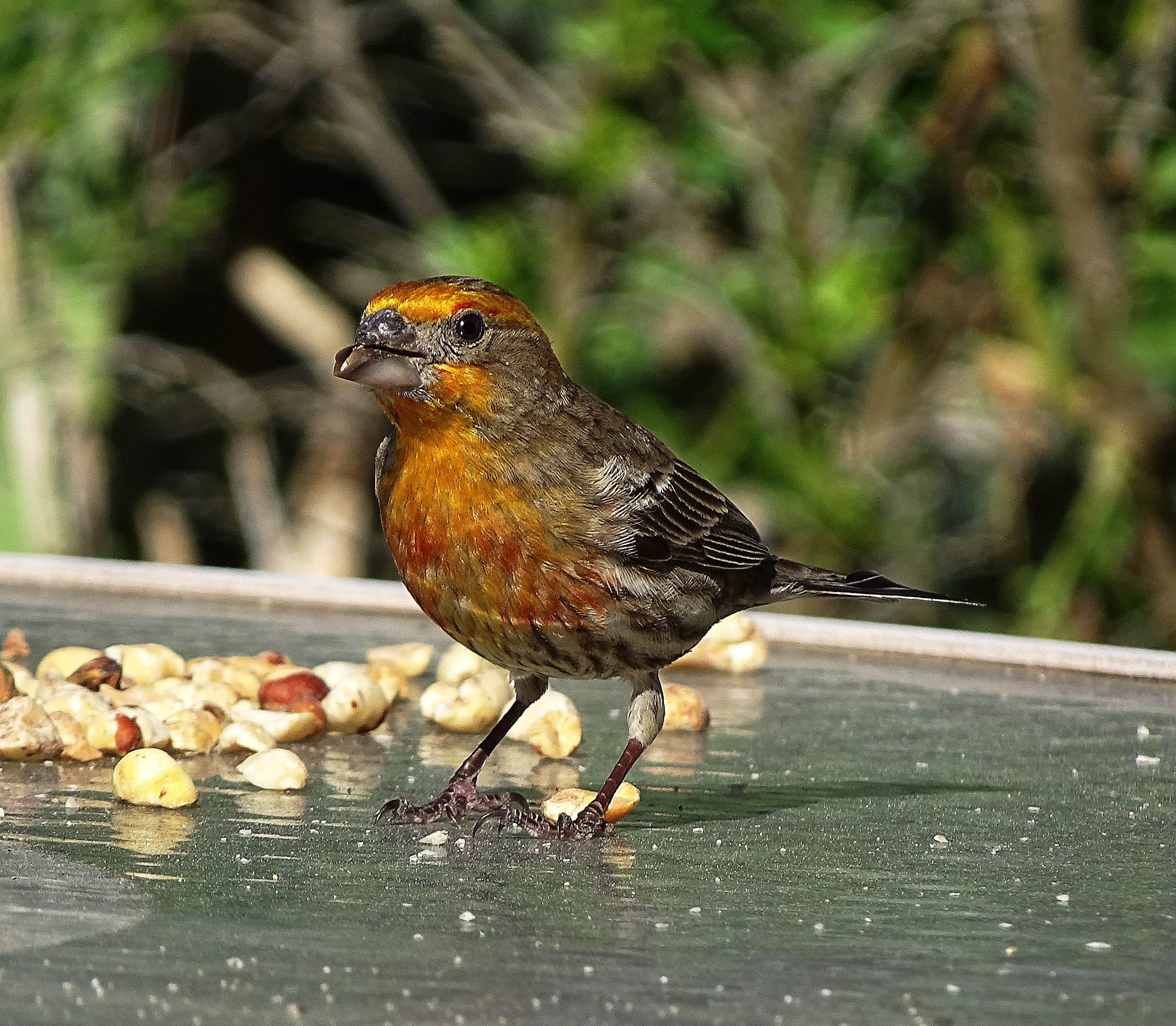 This yellow house finch has a deformed beak and foot, but is doing well on Holler handouts.