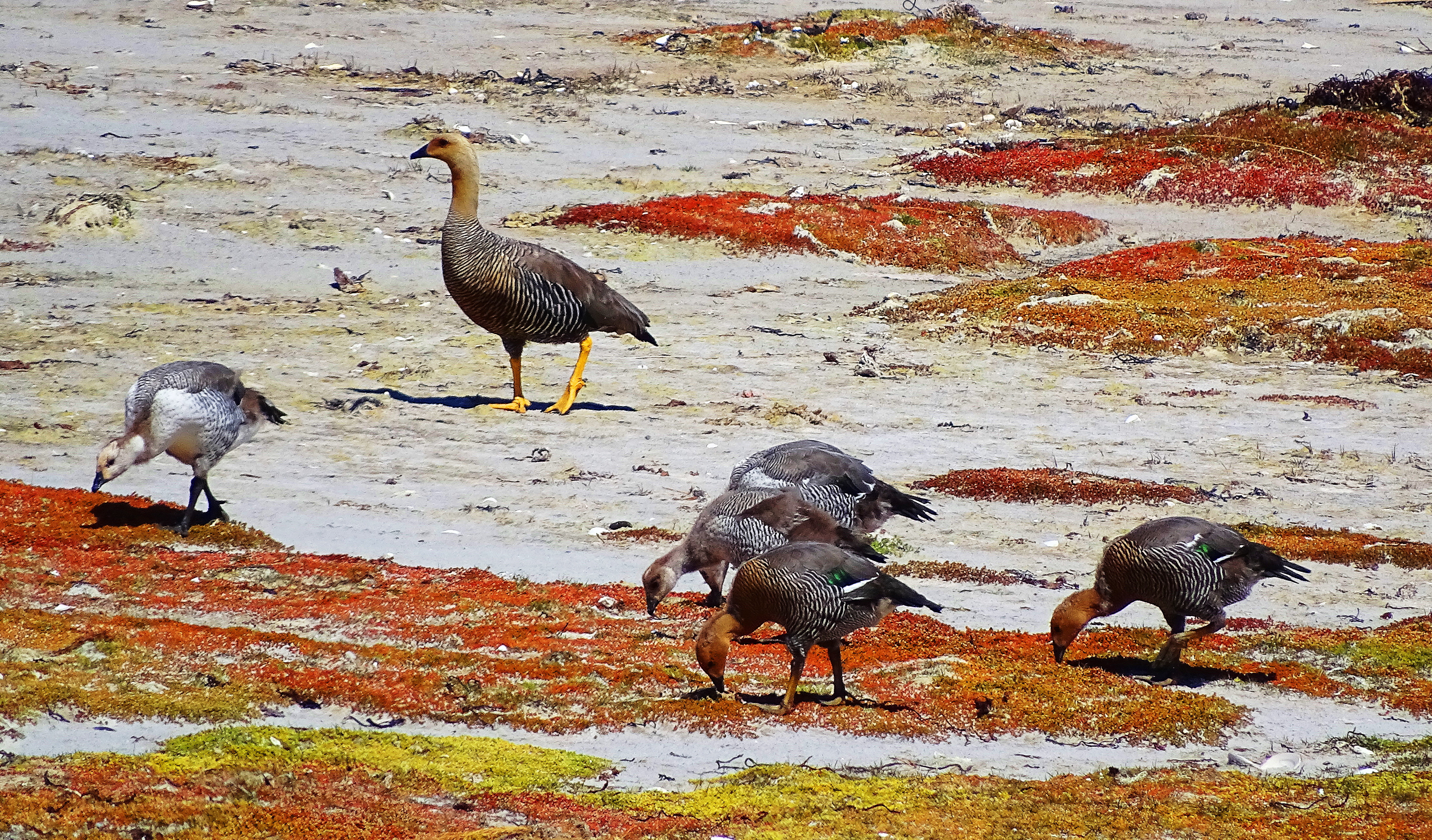 In this group shot, the legs are not really cooperating, but my guess is still Upland Geese, males with black legs, and females with yellow. But they could be Ruddy Headed Geese.