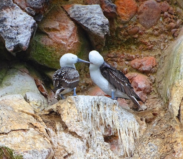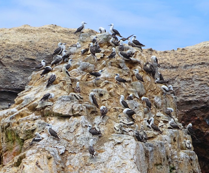 There are six different types of sula species. They are commonly called boobies because of the comical method in which they land, often stumbling over their large feet, and because they were incorrectly assumed to be not be very intelligent. These are quite smart Peruvian Booby adults and juveniles on Islas Ballestas.