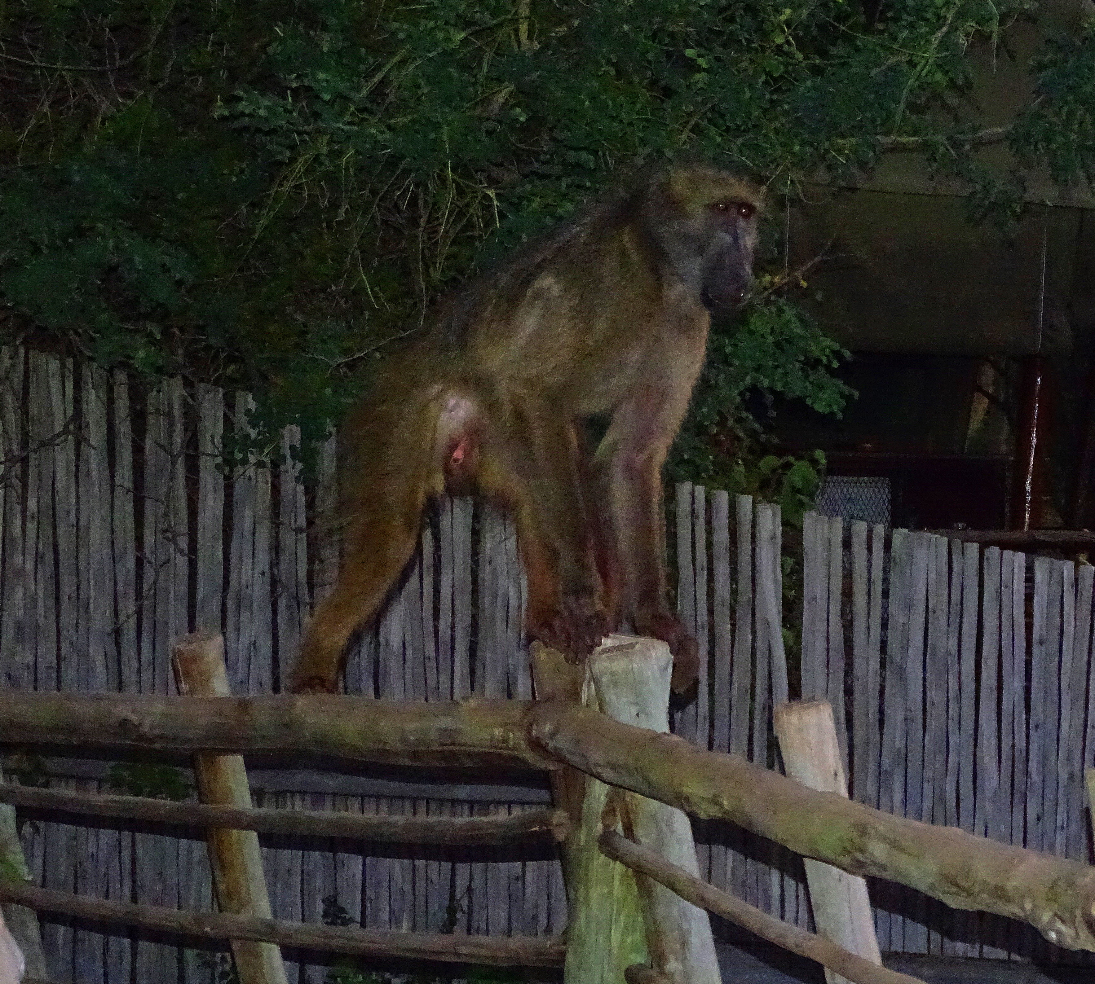 Jim had just walked away. I was snapping a few last sunset shots, when a large furious male baboon, leaped the fence in the tree tops, jumped onto the platform in front of me, and ran directly towards me in a rage.