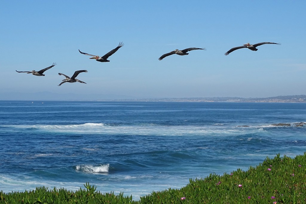 Beautiful pelicans. When we go to Florida and Jamaica they are one of the best draws to sit on the beach and just enjoy the birds passing by as we relax. Lovely.