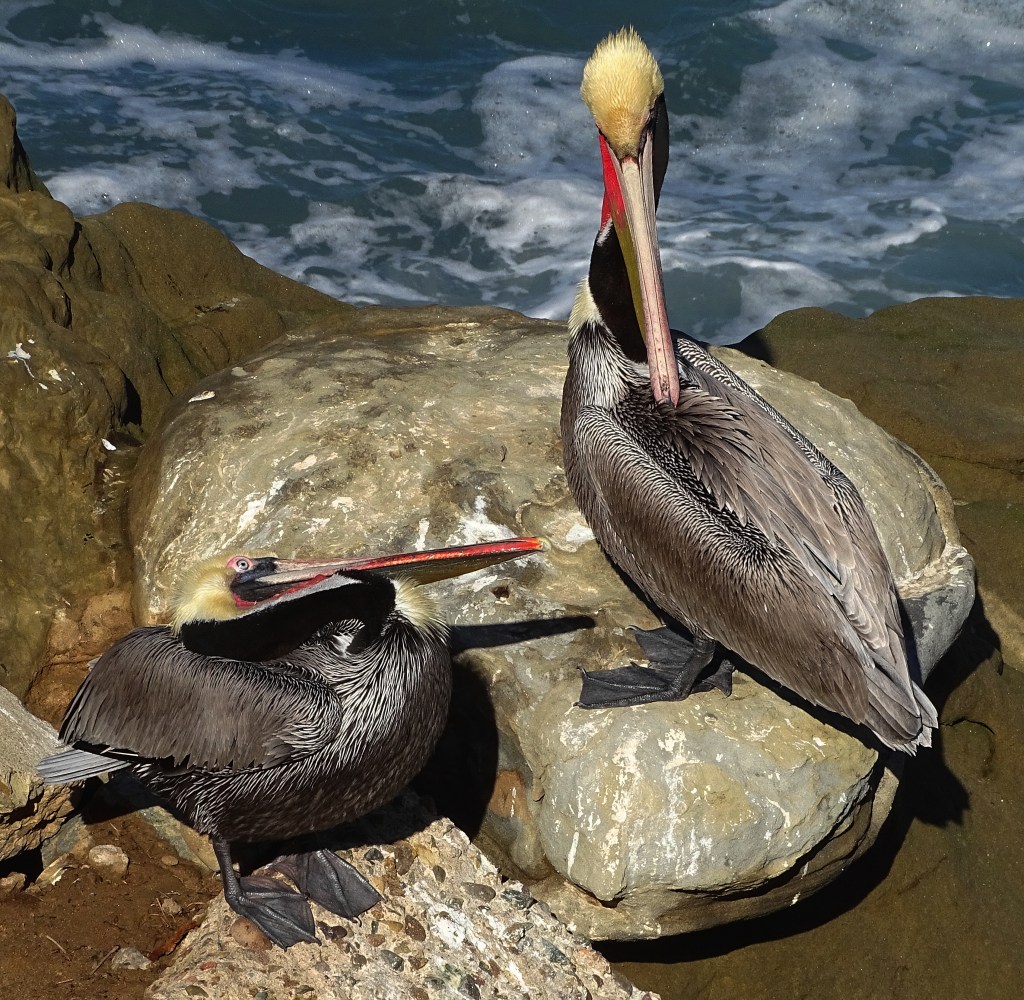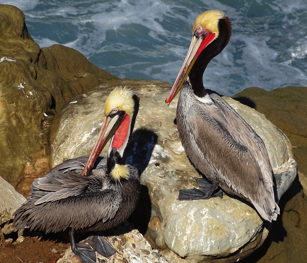 They’re cute and colorful and appear to enjoy your attention Cindy! The pelicans on the east coast are gray and shy.