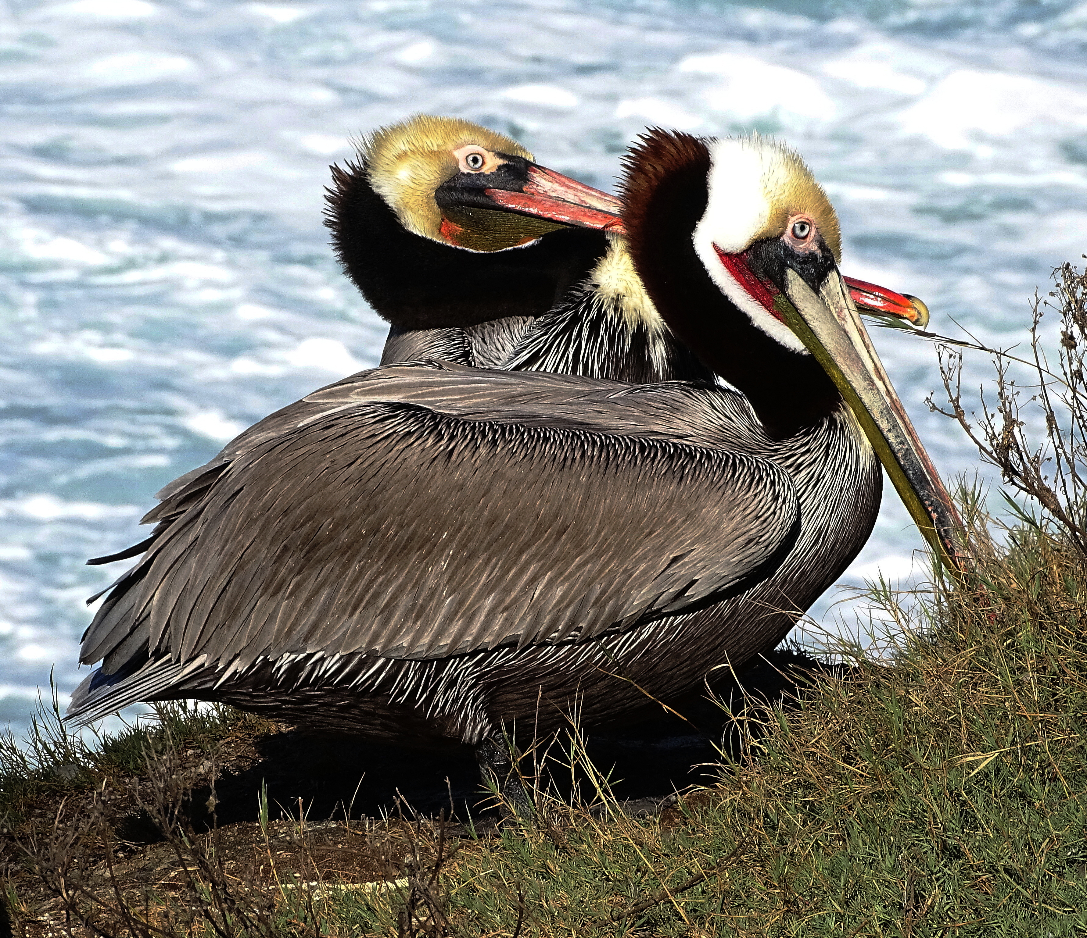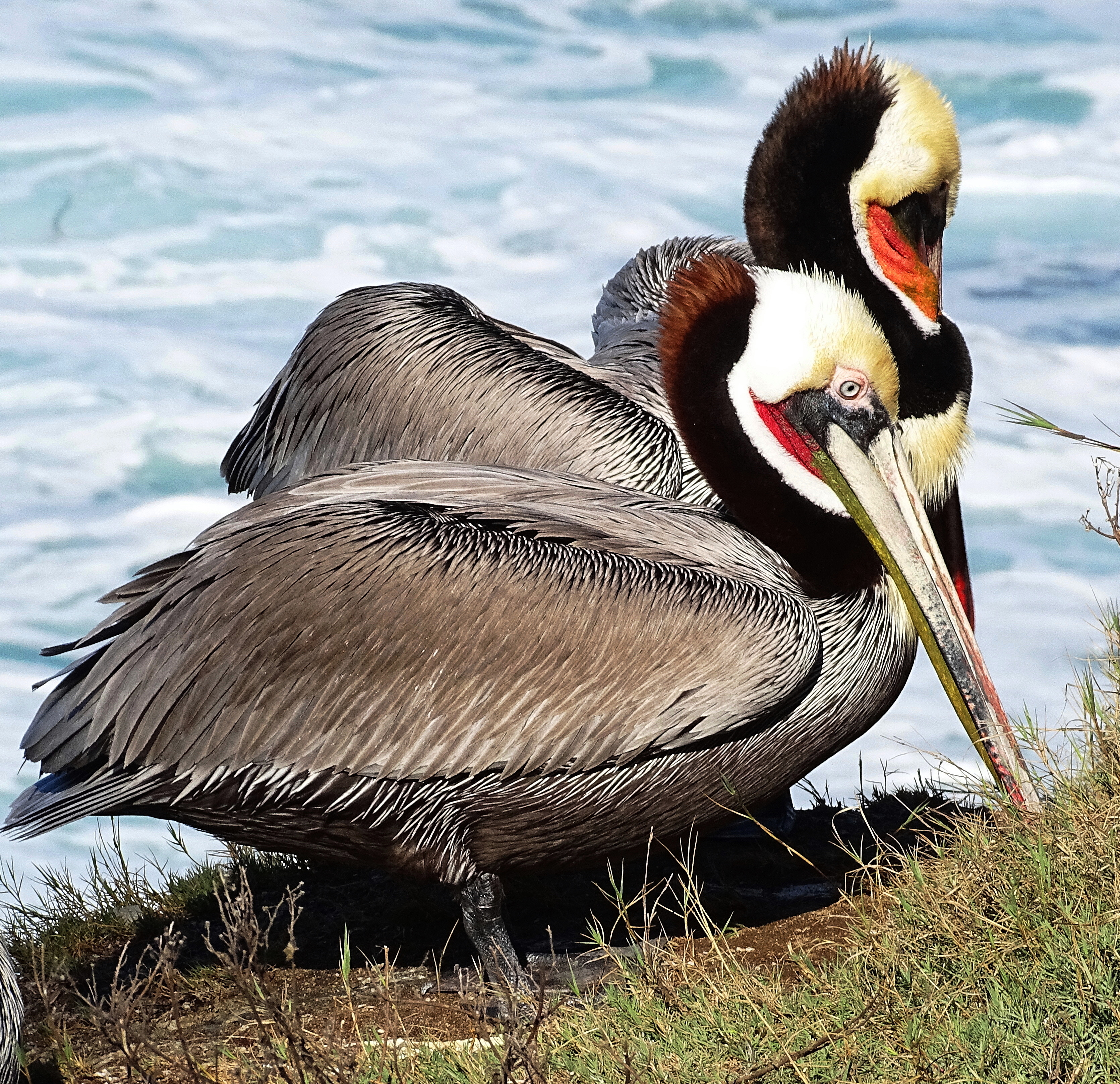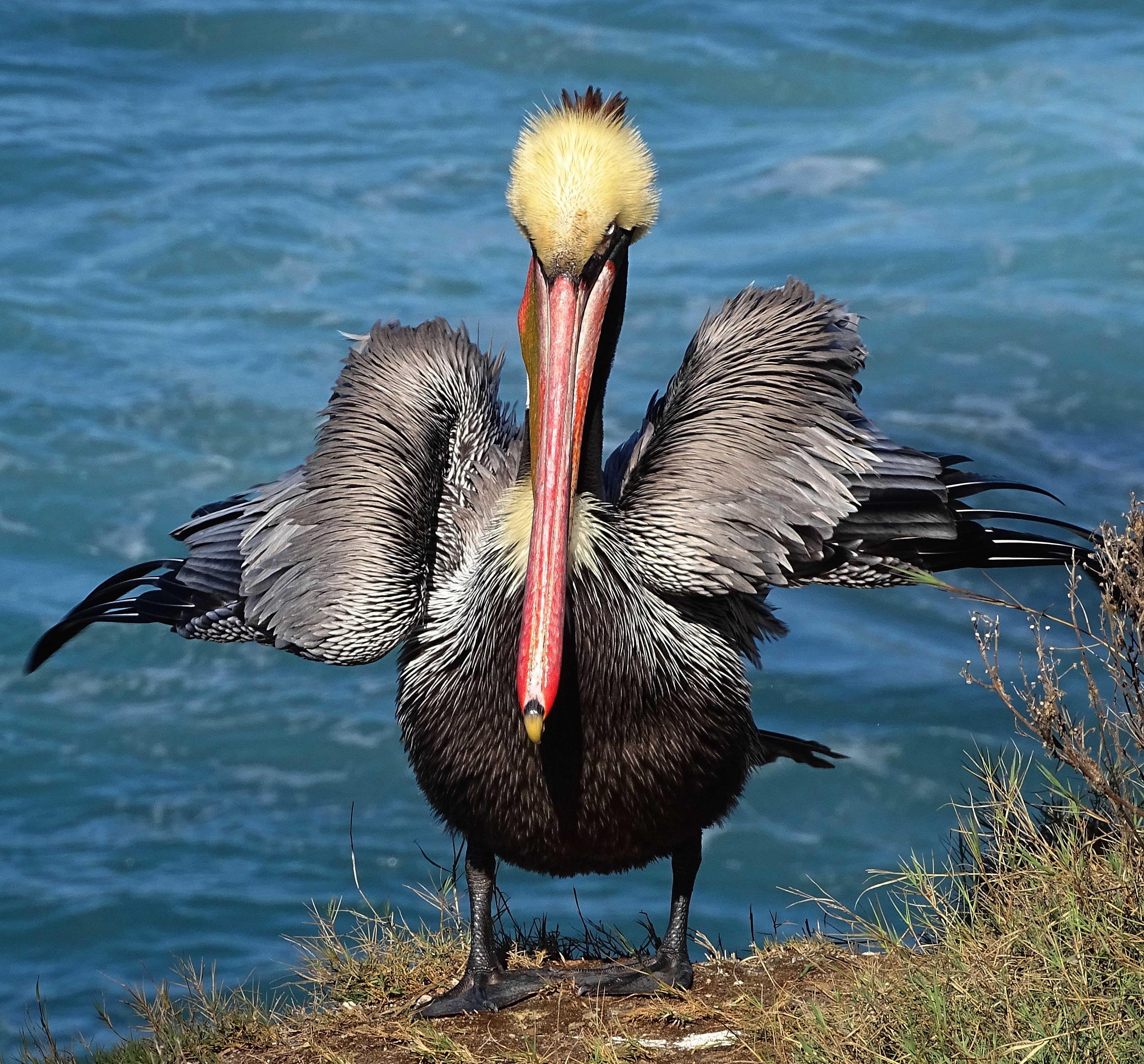 Used to the grey head variety in Monterey; never seen reds before. Pelicans, odd looking bird, but on the wing, majestic. One of my favorites to see in person. Thanks Cindy.