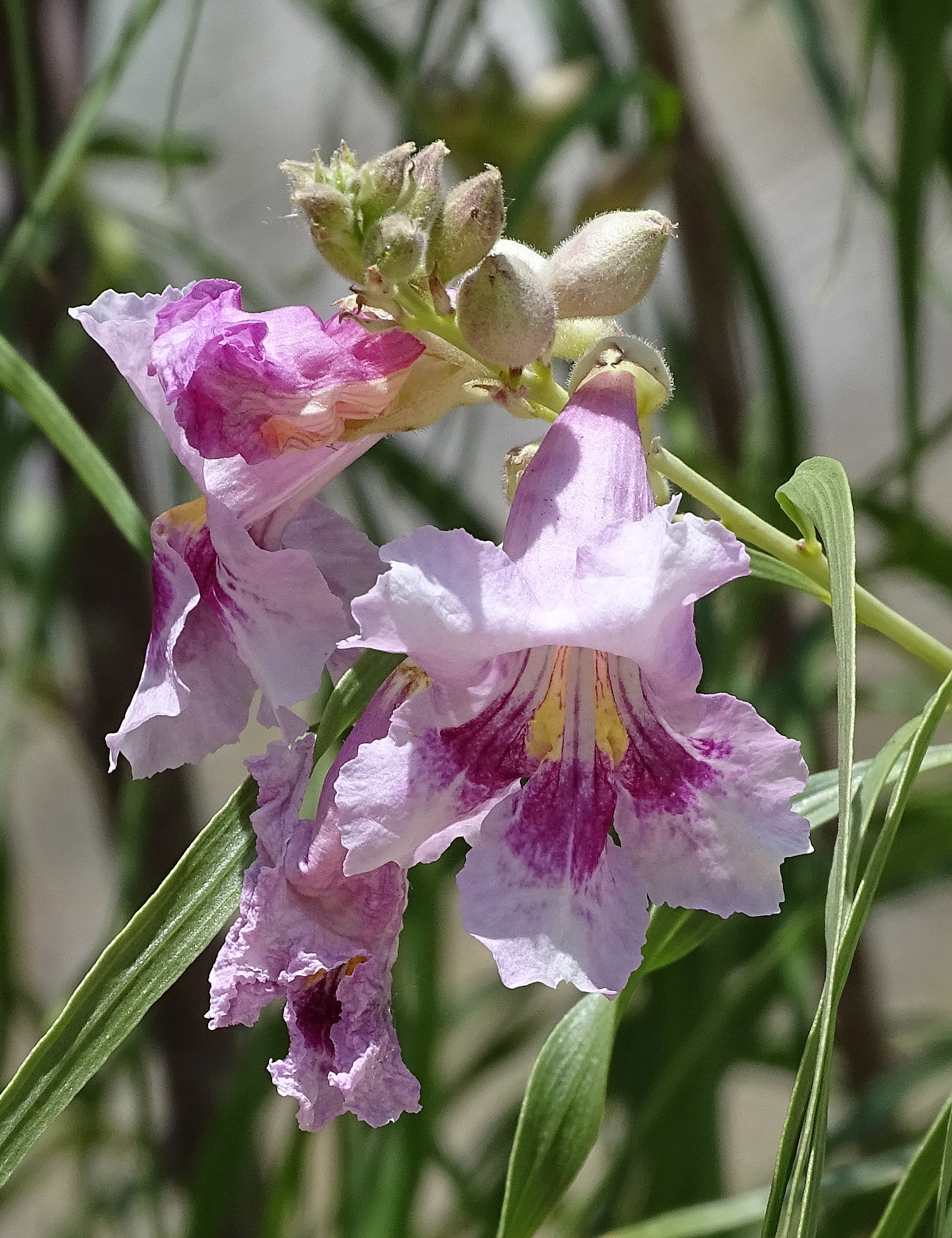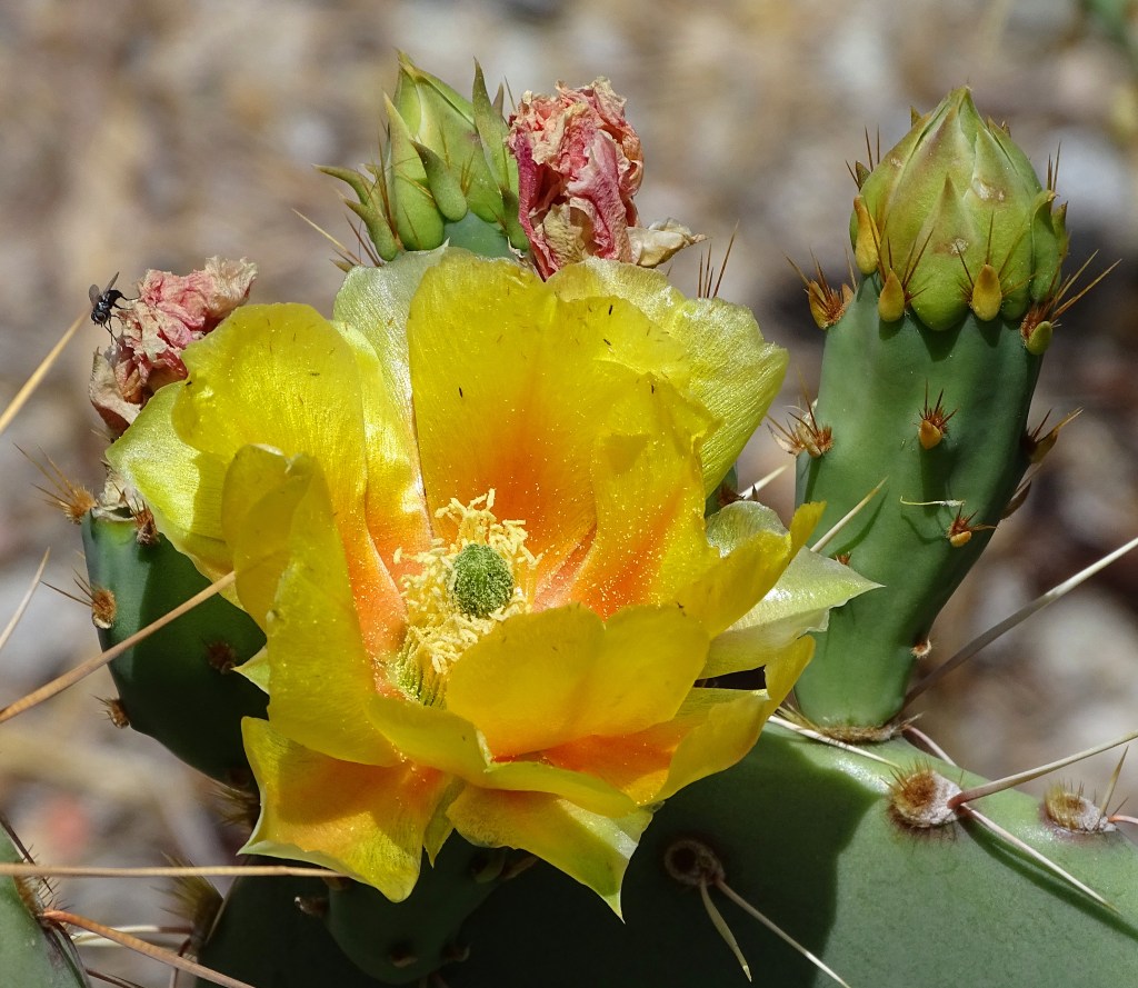 Note: Desert wildflowers in order are: Bristlebush, Prickly Pear Cactus, Desert Willow and Desert Marrow.