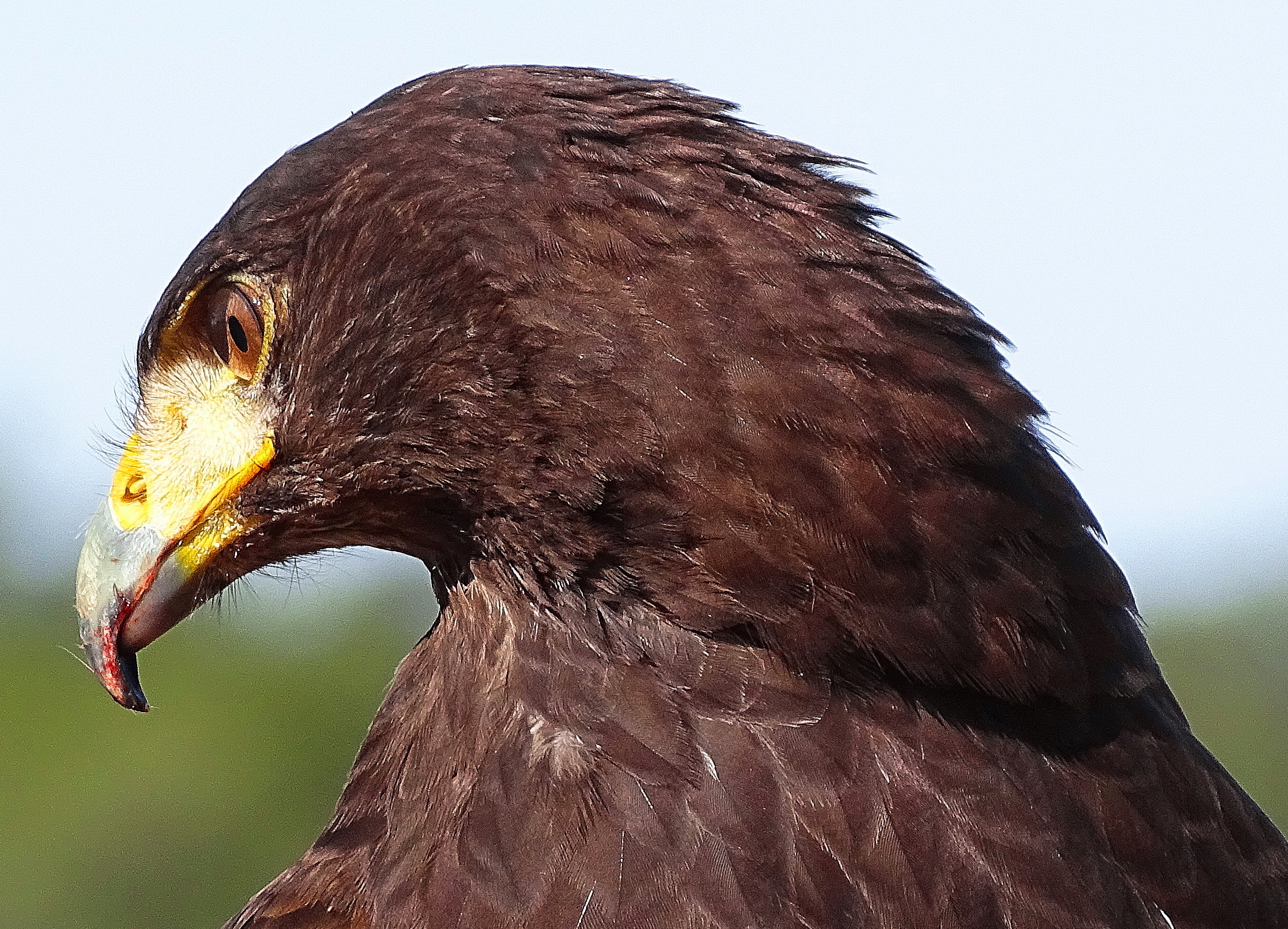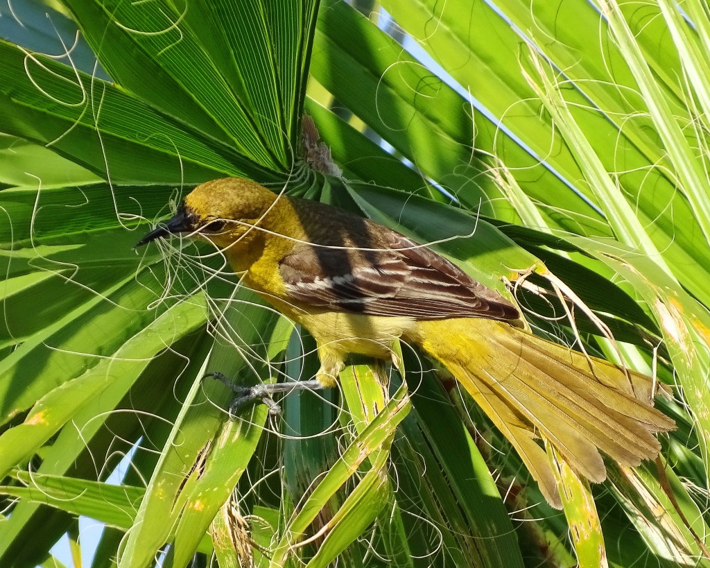 Female orioles are supremely talented weaver birds, and design intricate and beautiful hanging nests from palm strings. This female is loading up on string to weave her nests.