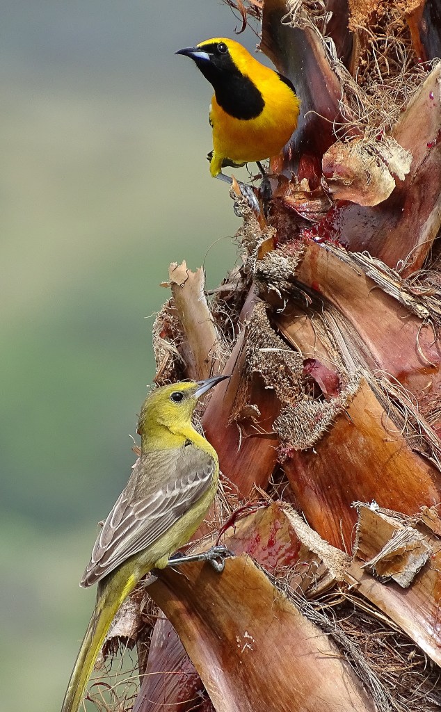 Quite a curious Hooded Oriole mated pair (click/tap to enlarge).