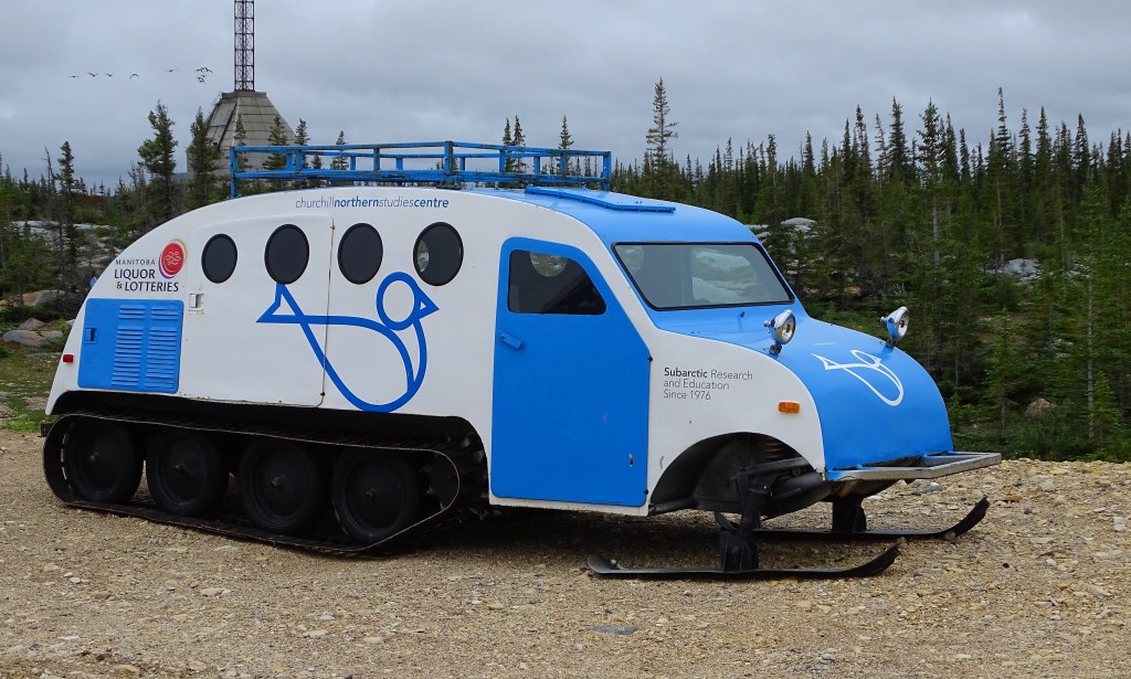 Churchill itself is a most remarkable and unique place. In the summer it is nippy, but in the winter, it is another story altogether. Hudson Bay freezes over and the polar bears are in their element. People, not so much. But clever and resourceful humans have adapted many ways to make life in this forbidding climate livable. Check out this polar research vehicle which you have to admit is pretty darn nifty. (In the background you can see an abandoned missile silo. More about this later).