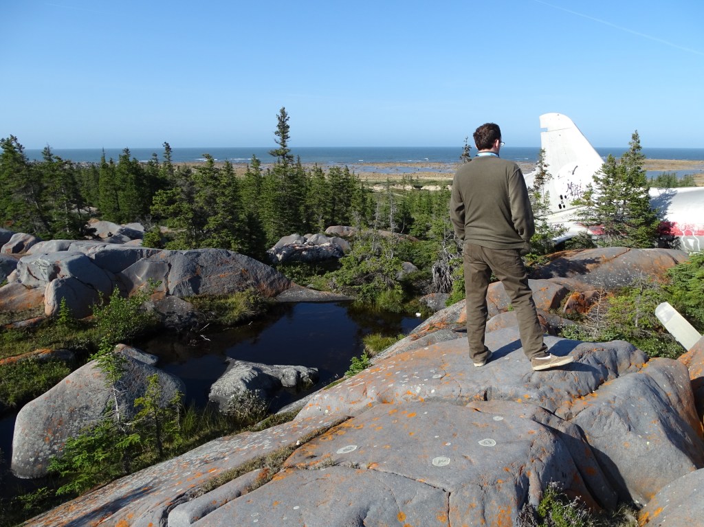 My son is checking out the wreck of a plane that crashed in Churchill in 1979. All aboard survived, but what ends up in Churchill, often stays in Churchill, because the only way in and out of town is either a train ride that takes about 45 hours, or an air flight. The commuter airline that makes the trip between Winnipeg and Churchill is called “Calm Air.” It offers a lovely ride that we enjoyed immensely, even though some locals refer to the airline as “Calamity Air,” due to, errrr…..unforeseen weather variations enroute.