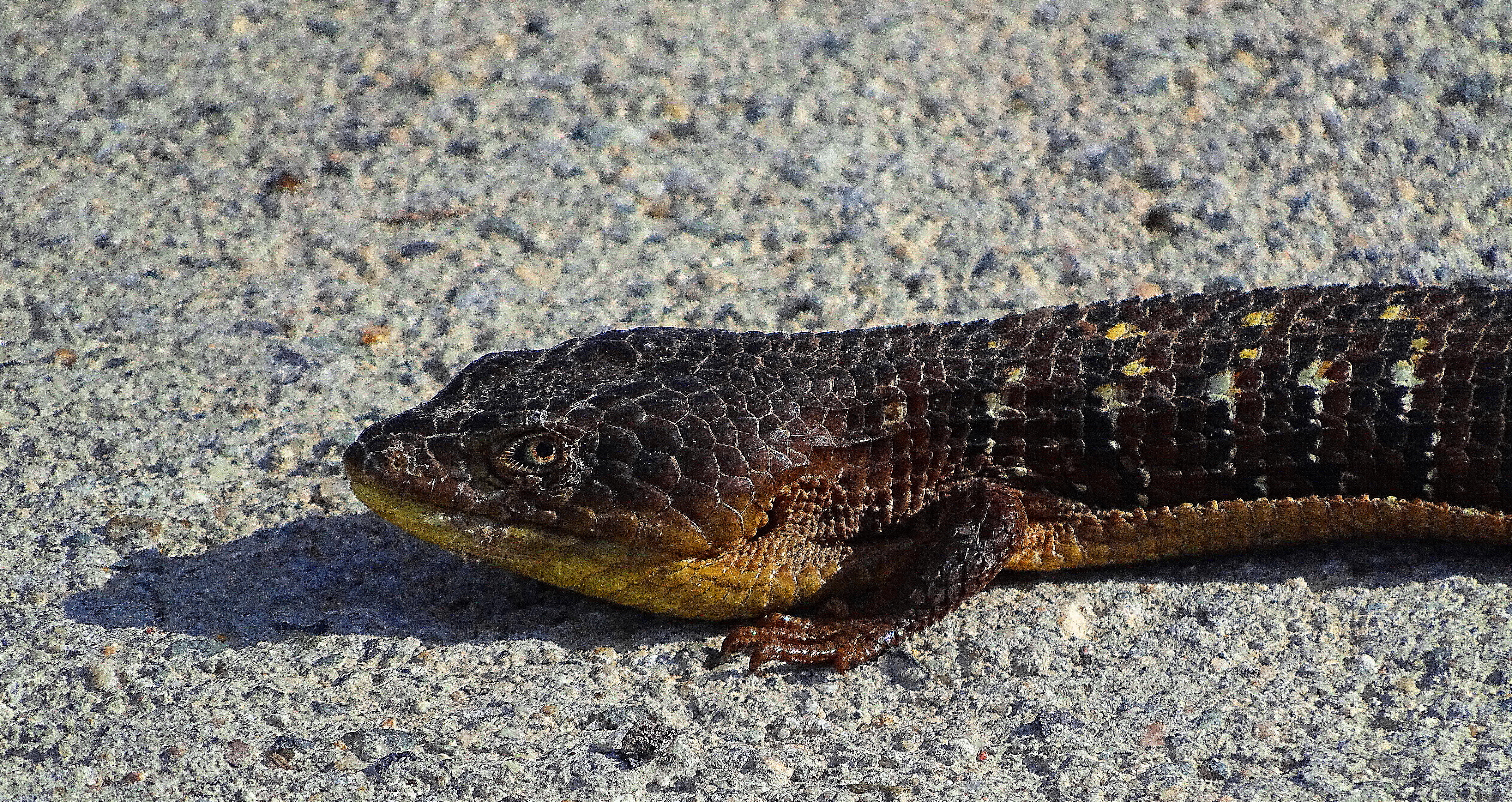 Fred knows us. He is a very large, very old alligator lizard, but he got much smaller when Meep-Meep, the roadrunner, relieved him of his tail, which he is diligently trying to grow back, and resting a lot accordingly. He is also molting which makes everything worse, poor Fred.