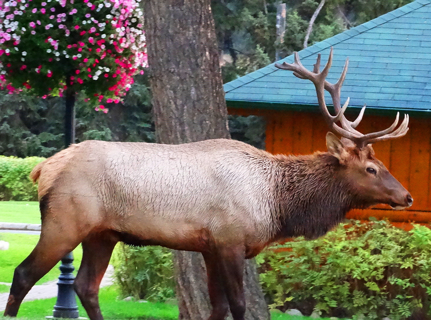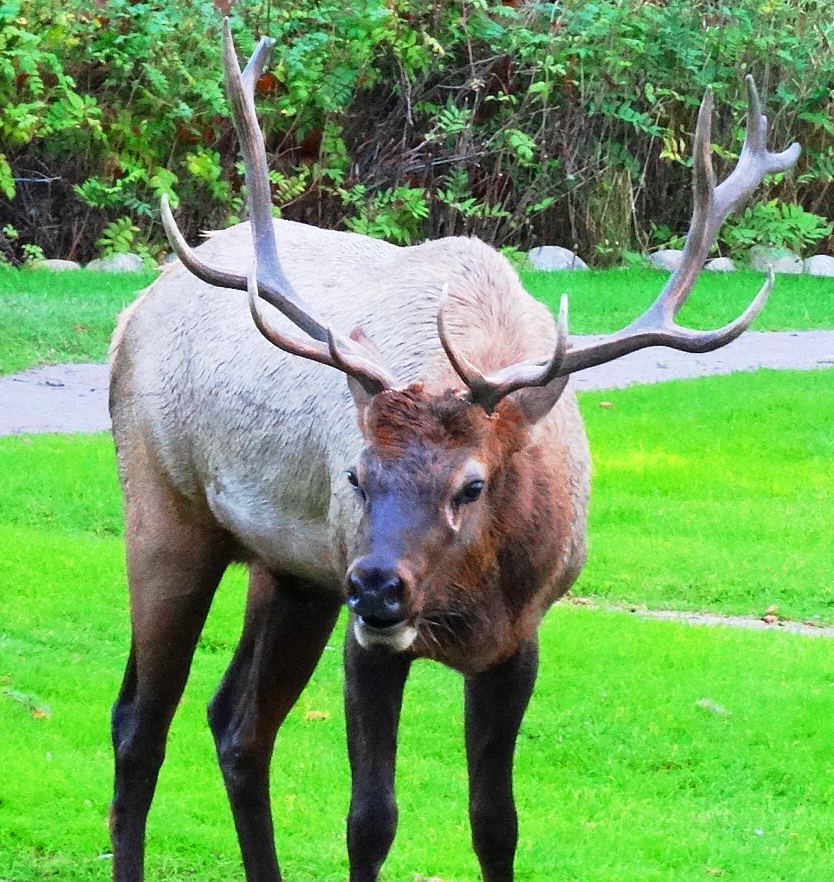 When all of a sudden there was this helacious din, that sounded something like a dinosaur. It is elk mating season in Jasper National Park, and I was right in the path of Sammy the suitor and his intended. No matter to him that his mating path was right in front of our cabin! He ran up to his intended, and saw me in his way….(Male elk in rut are somewhat deranged and can be quite dangerous, especially if you are in the way of true romance!)