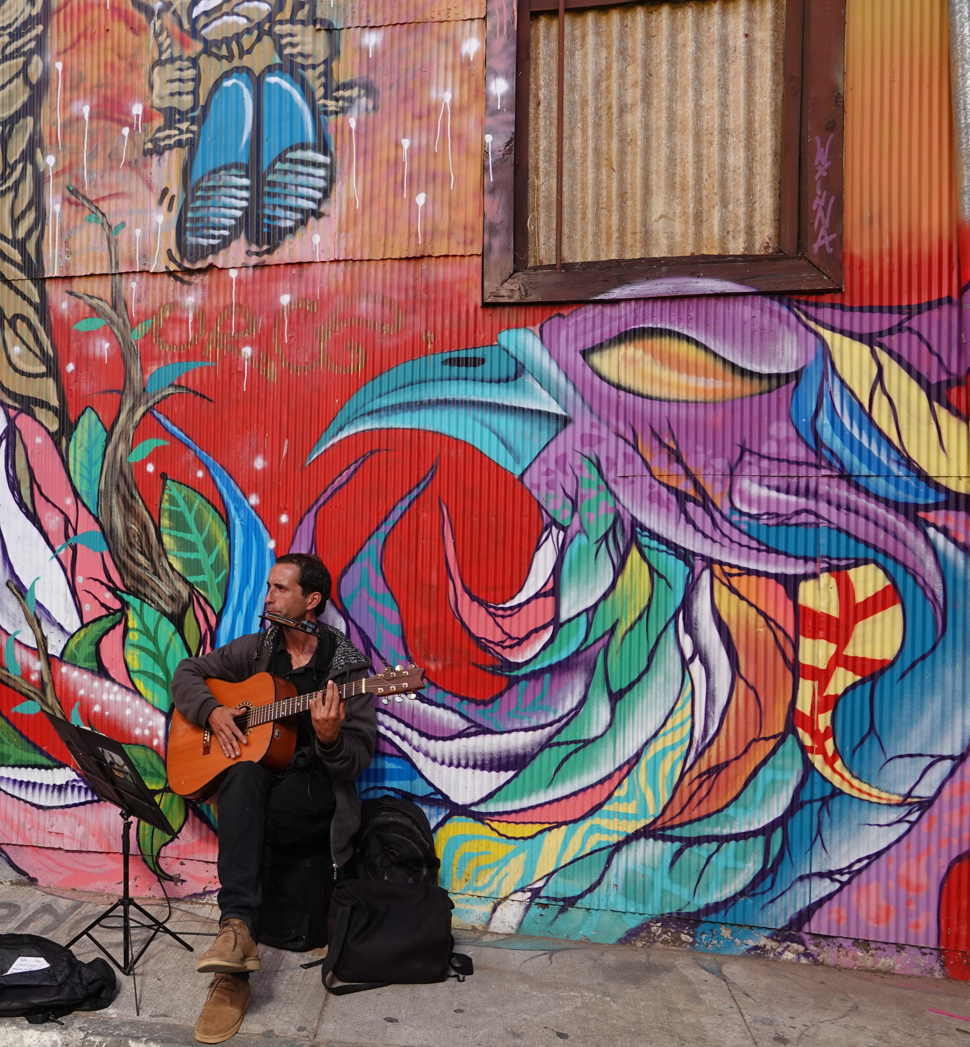 The city of Valparaiso Chile is full of over a thousand large scale open air art murals, some like the one above, cover the walls of multi-story buildings.