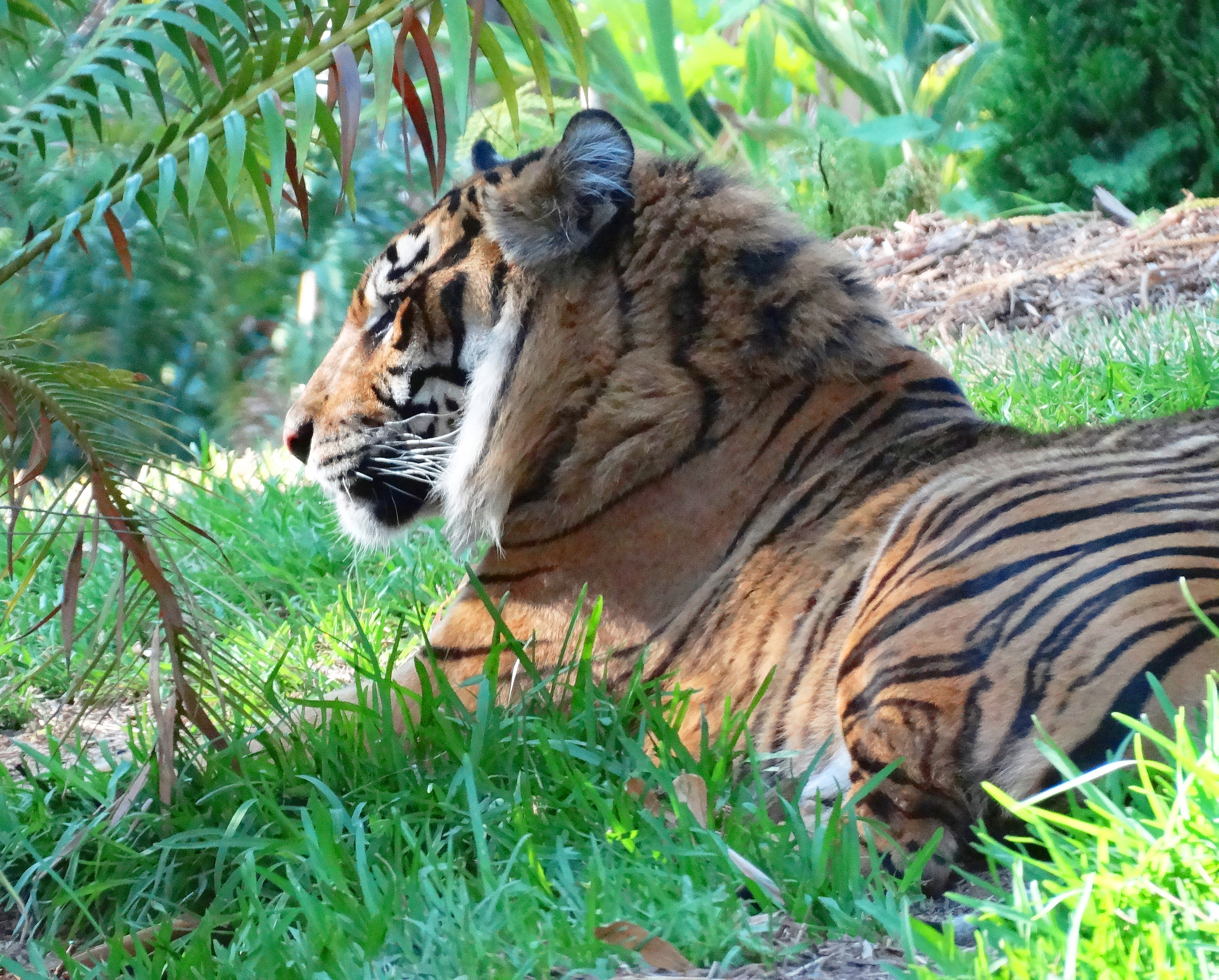 The Sumatran Tigers are in a brand new, outdoor, 5.2 acre, multi-level exhibit at The San Diego Safari (Wild Animal) Park. The exhibit houses breeding tigers and is filled with trees, plants, waterfalls, streams and ponds.